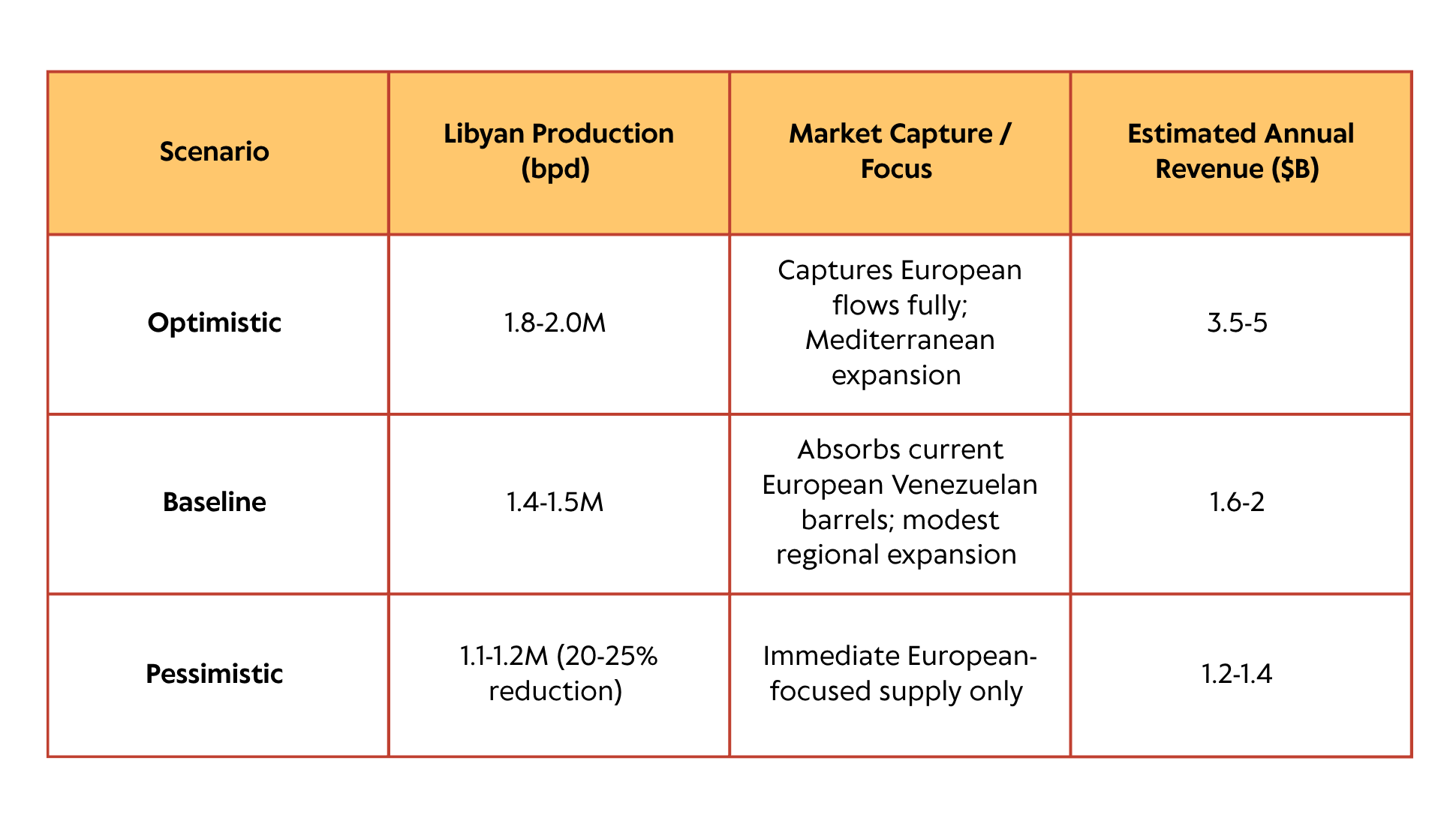 If Libya reaches its stated production target of 1.6 million barrels per day by 2026, European refiners could absorb the majority of Venezuelan crude that flowed into the continent in 2024, at 75,000 bpd. In revenue terms, this translates to approximately $1.6-1.8 billion annually, assuming an average Brent price of $60-65 per barrel. While still smaller than headline global reserve figures, these barrels are strategically concentrated, giving investors direct access to high-margin, crisis-sensitive supply in a market scrambling for alternatives. Scenario analysis highlights the risk-reward tradeoff: