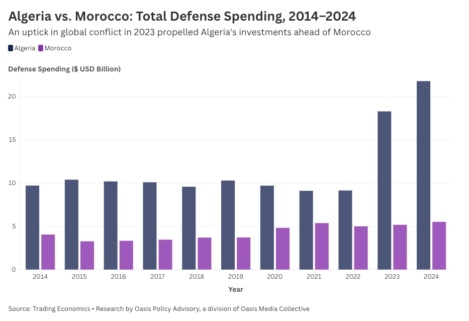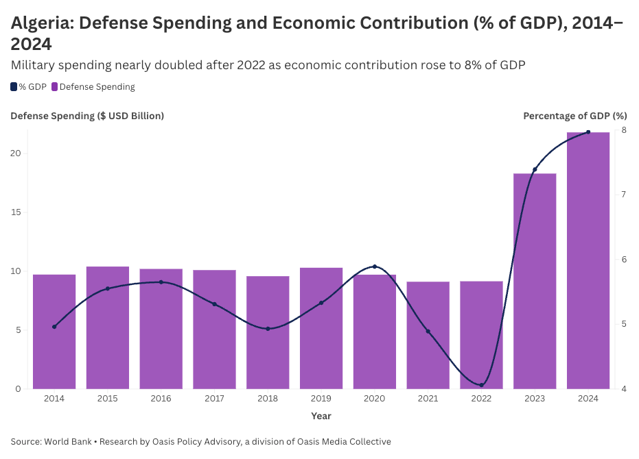 In 2020, when the Western Sahara ceasefire collapsed, Algeria allocated $9.11 billion to defense compared to Morocco’s $5.38 billion. By 2024, Algerian spending had exploded to $21.8 billion, nearly 8% of GDP, while Morocco held steady at $5.52 billion. The spending ratio, once relatively balanced, now stands at nearly 4:1.