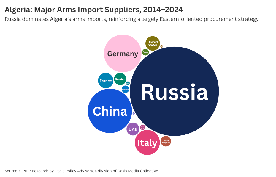 More revealing though than spending levels are procurement patterns. Algeria’s military remains overwhelmingly oriented toward Eastern suppliers: 61% of arms imports come from Russia, another 15% from China. Approximately 413 of Algeria’s active aircraft originated from the Soviet Union, a legacy relationship that Moscow continues to cultivate with advanced systems like the Su-57.