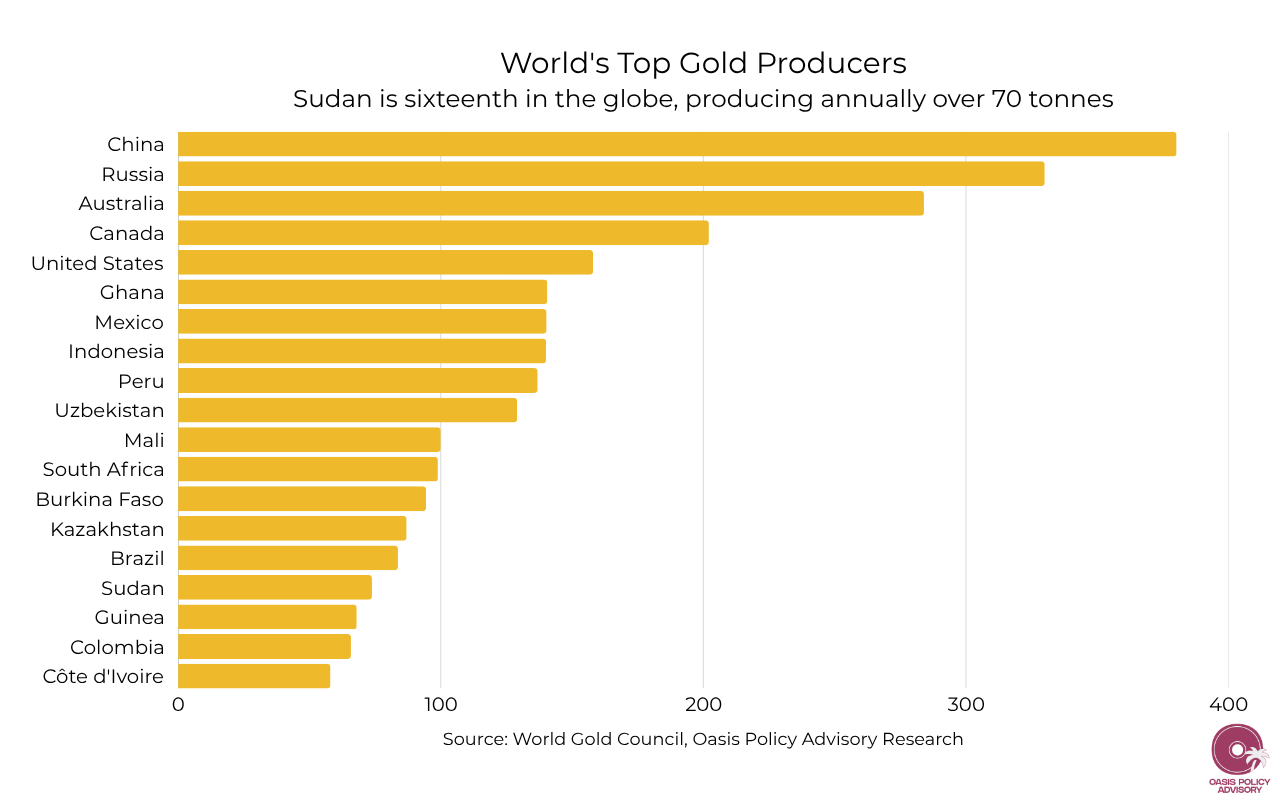 Sudan produces roughly 70 tonnes of gold annually, generating $1.57 billion in official export revenues in 2024. But official figures are almost certainly an undercount; estimates suggest smuggled gold runs at roughly four times the legal export volume. Sudan ranks fifth across the continent in terms of gold production and sixteenth worldwide.